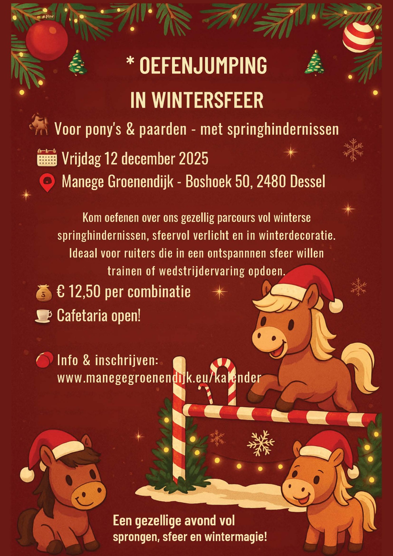β¨ Kom oefenen over een gezellig parcours vol winterse springhindernissen, sfeervol verlicht en in winterdecoratie. Ideaal voor ruiters die in een ontspannen sfeer willen trainen of wedstrijdervaring opdoen.
